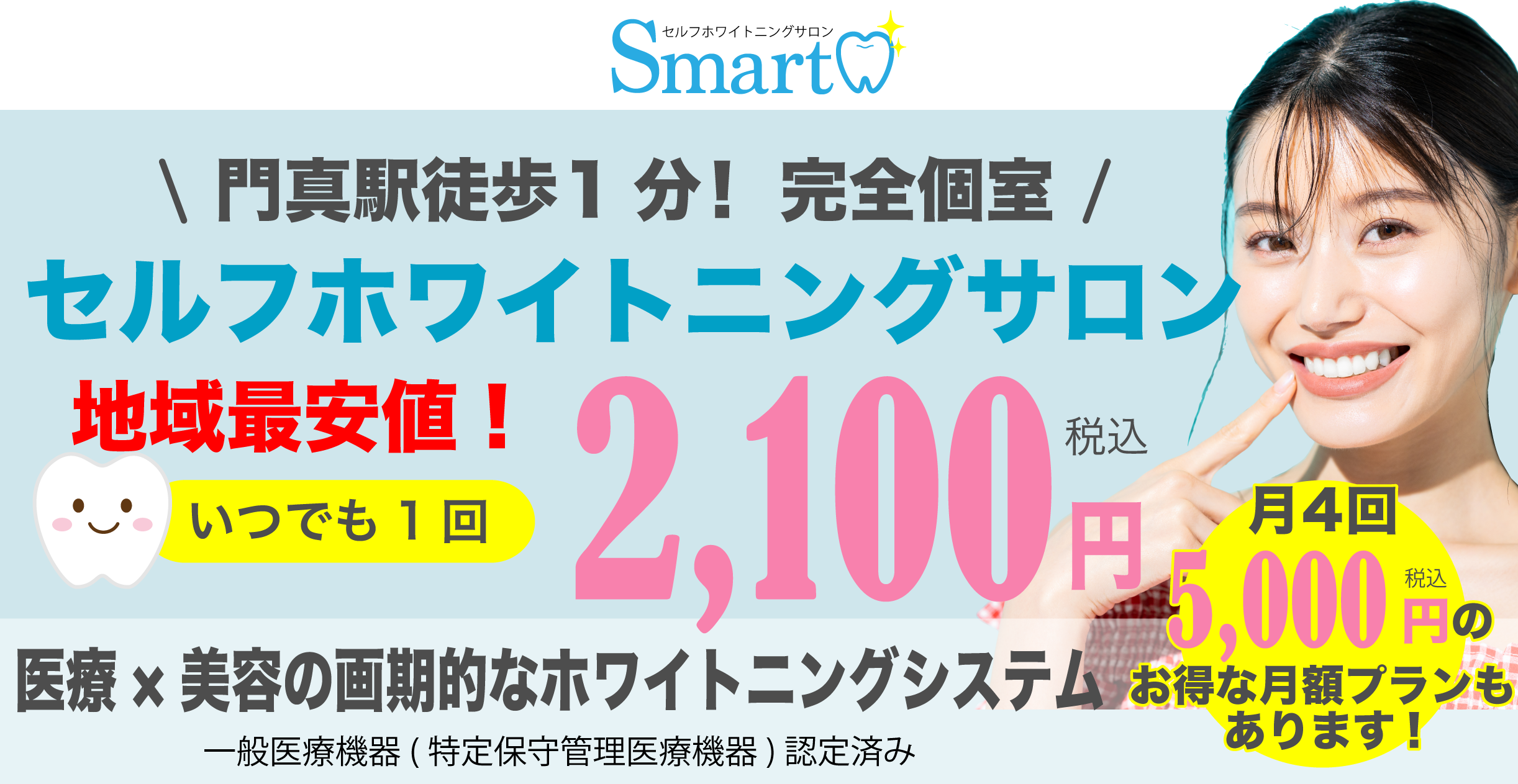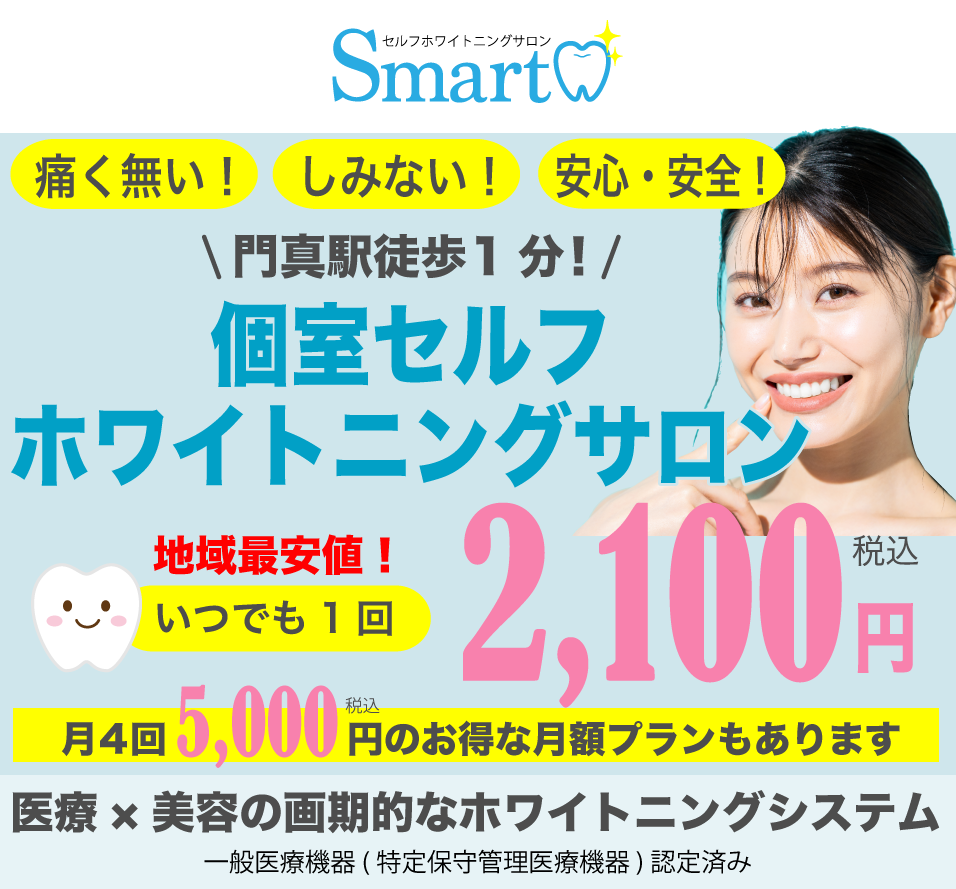 ホワイトニングは通常1回4,000円ほどの料金となりますが、当店では1回 2,100円の都度払いでホワイトニングが可能です。 さらに、継続して通いたい方に大変お得な月額5,000円(月4回)の月額プランもございます。